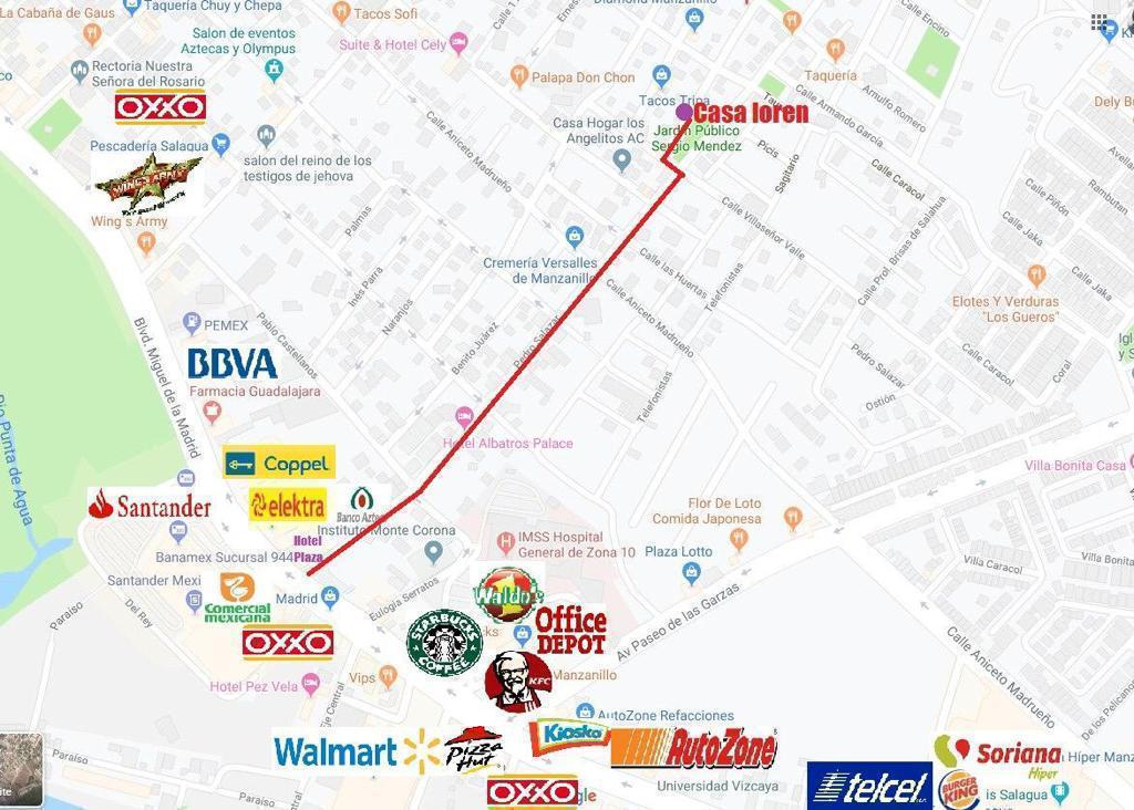 La casa esta ubicada a solo unas cuadras del Boulevard Costero Miguel de la Madrid a la altura de la comercial mexicana, Elektra, Banco Azteca, Coppel, Walmart, BANCOS ( bancomer BBVA, Citibanamex, Banco Azteca, Scotiabank, Santander, etc), Wings Army, Farmacia Guadalajara, etc y a unas 6 cuadras de la otra avenida principal de Manzanillo que es la Avenida Elias Zamora Verduzco.